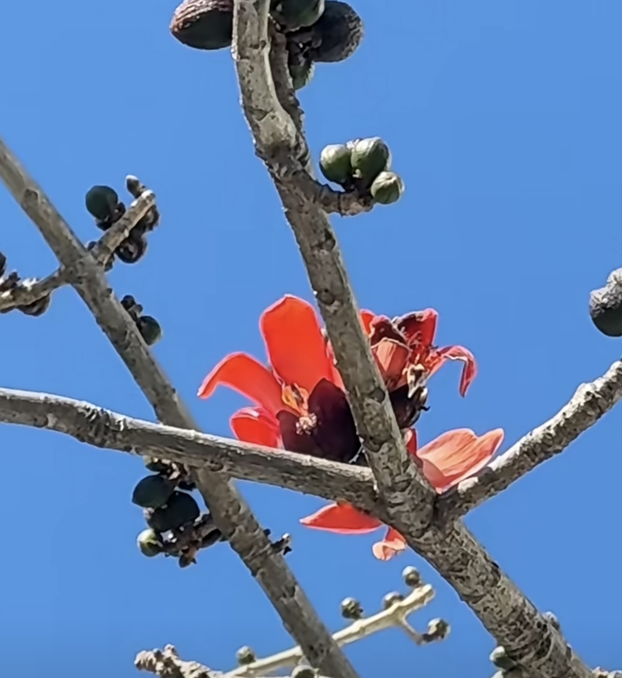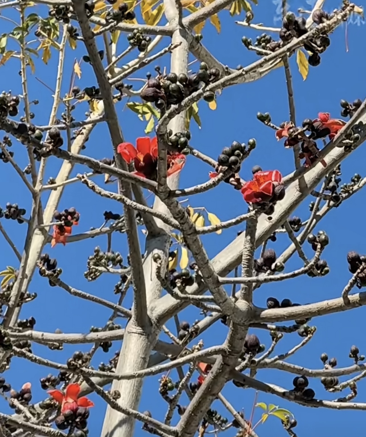 一月的攀枝花学院图书馆旁,一株“不守时”的攀枝花树(木棉树)已悄然点燃了数十支“火把红”。在充足的冬日暖阳下,它比同伴们早醒了近一个月,成为校园里一道意外的风景线。