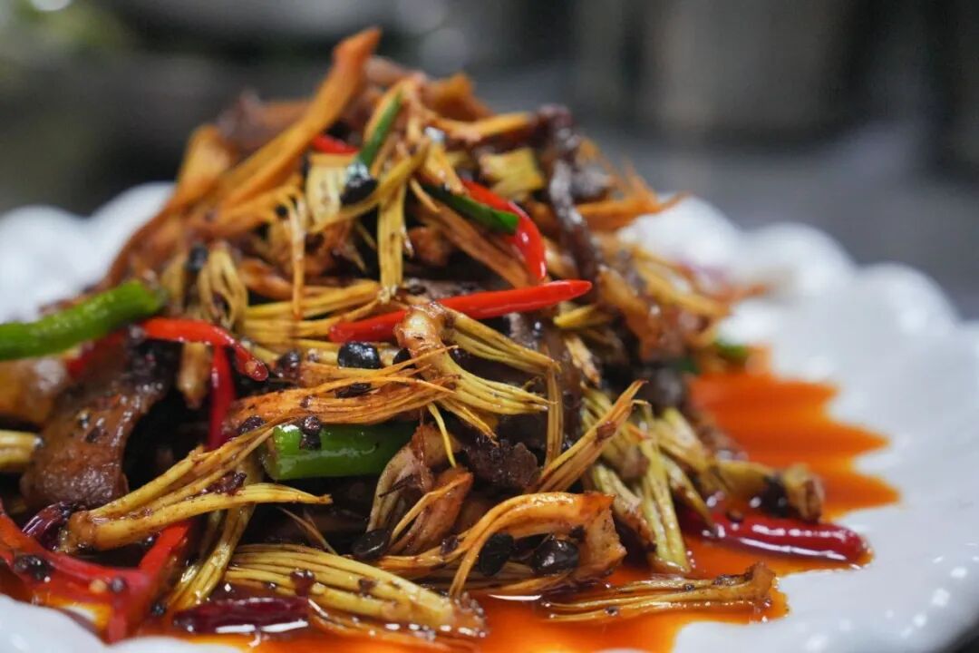 这道时令菜做法质朴却滋味独特:去除花瓣、花心和黑色柱头,保留花蕊撕成小瓣,焯水后与煸香的腊肉同炒。成菜色泽金黄,口感滑脆,花蕊的清新恰好中和了腊肉的咸香,鲜香四溢。